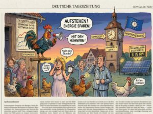 „Wir müssen den Tag nach vorne verlagern“, so ein Sprecher der Energie-Taskforce. „Das Ziel ist das konsequente Aufstehen mit den Hühnern und Hähnen. Wer früher arbeitet, braucht abends weniger künstliches Licht und Heizung.“
