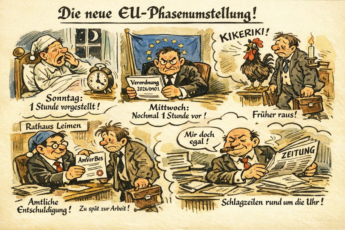 (fwu – 28.3.26) Um die Belastung für den Biorhythmus zu senken und die Tageslichtnutzung angesichts der globalen Energieknappheit zu maximieren, hat die EU-Kommission eine kurzfristige Sonderregelung erlassen: Die „Phasenumstellung“.