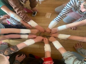 In Zweiergruppen legten sich die Kinder daraufhin gegenseitig zur Übung einen Verband an. Jedes Kind bekam außerdem ein Stethoskop und durfte seinem eigenen Herzschlag lauschen. Zu Beginn im Ruhepuls, daraufhin, nachdem die Gruppe 1 Minute auf einer Stelle gehüpft ist, bei erhöhter Herzfrequenz. Als letzten Eindruck gingen die Kinder mit der Sanitäterin in einen Rettungswagen hinein, schauten sich den Aufbau des Wagens an und schalteten das Martinshorn für wenige Sekunden an.