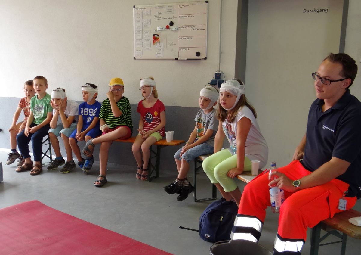 4091 - DLRG DRK Ferienprogramm - 2Selbst jüngere Kinder können schon zu Lebensrettern werden! Was man an lebensrettenden Erstmaßnahmen an einem Unfallort machen muß, wie man einen Verletzten und Bewußtlosen anspricht und ihn in die stabile Seitenlage bringt, das gehörte zum Ausbildungsumfang der DRK-Station. Auch das Anlegen von Verbänden wurden hier gezeigt und geübt und nachdem jedes Kind entsprechend mit Verbänden versehen war, kam man sich vor wie in einem Katastrophengebiet. „Hauptopfer“ bei der Vorführung spiele Kai Brümmer als lebender „Dummy“, an dem sämtliche Erstmaßnahmen für einen Verletzten gezeigt wurden. Lediglich das Anlegen einer Infusion wurde (zu seinem Glück) nur theoretisch gezeigt, so daß er die Vorführung unverletzt überstand. Die Kinder zumindest waren – anders als der „dauerbewußtlose“ Unfallopfer-Darsteller – die ganze Zeit hellwach und auf dem besten Wege, echte Erstretter zu werden.