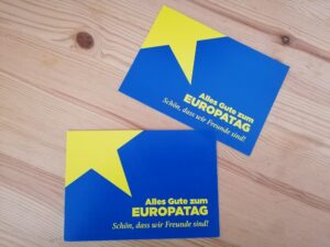 persönliche Beziehung auf, und verbindet sie mit dem Europatag. Im besten Fall kann daraus eine Tradition entstehen, zum Europatag Karten an nahestehende Menschen im In- und Ausland zu
