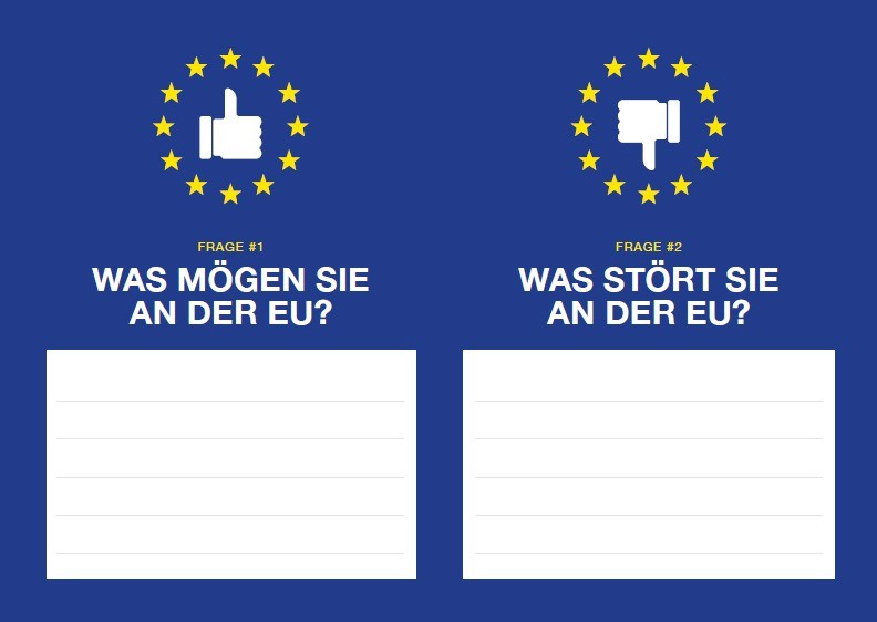 Im letzten Jahr bin ich bei den Gesprächen bei meinen Infoständen mit Lob, Kritik und Fragen zur EU konfrontiert worden. Natürlich konnte ich nicht auf alles intensiv eingehen und nicht jede Frage beantworten. Daher haben wir in diesem Jahr haben wir noch eine weitere Karte entwickelt, die nicht zum verschicken in die Ferne gedacht ist, sondern zum Dialog mit der EU auffordert. „Was mögen Sie an der EU?“ „Was stört Sie an der EU?“ „Welche Fragen haben Sie zur EU?“ Diese Karten können Sie direkt am Infostand ausfüllen oder bei den Rathäusern der Stadt einwerfen.