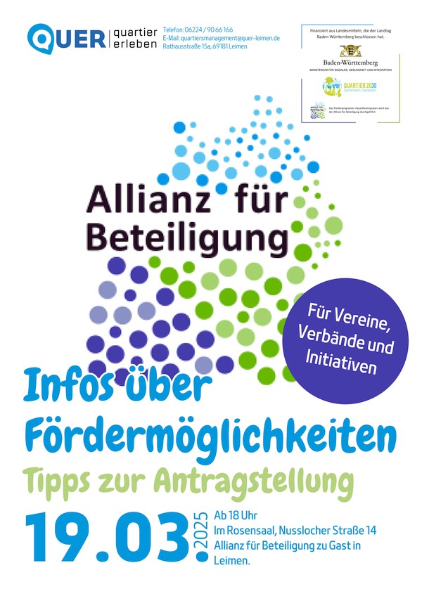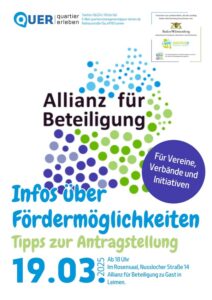Die Veranstaltung richtet sich an alle, die sich ehrenamtlich engagieren und Fördermöglichkeiten für ihre Projekte kennenlernen möchten. Der Eintritt ist frei. Weitere Informationen gibt es auf der Homepage der Allianz für Beteiligung.