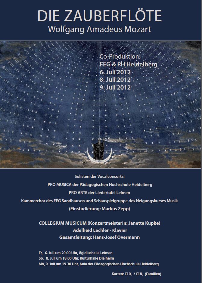 Zum ersten Mal in der Geschichte der Pädagogischen Hochschule, wird am 9. Juli 2012, pünktlich zu ihrem 50-jährigen Jubiläum, von Studenten der Vocalconsorts PRO MUSICA und PRO ARTE, unter der Gesamtleitung von Hans-Josef Overmann, eine komplette Oper, „Die Zauberflöte“ von Wolfgang Amadeus Mozart, aufgeführt.
