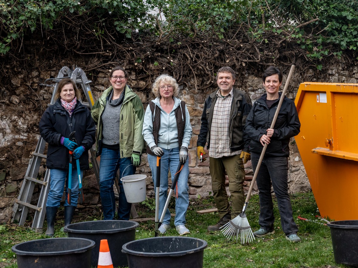 Mit den ersten Arbeiten dazu haben die Engagierten am Samstag, den 28. Februar, begonnen. Es ging dem wuchernden Efeu an der kaum noch sichtbaren historischen Mauer an den Kragen – nur einzelne Triebe durften bleiben. Der Container, den die TBL dankenswerterweise zur Verfügung stellten, war nach gut zwei Stunden ordentlich gefüllt.