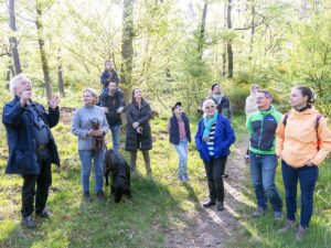 Aufmerksame Zuhörer im Frühlingswald: Prof. Michael Wink (ganz links) erklärt beim Spaziergang mit Christiane Staab (2. v.l.) die Stimmenvielfalt der Vogelwelt.