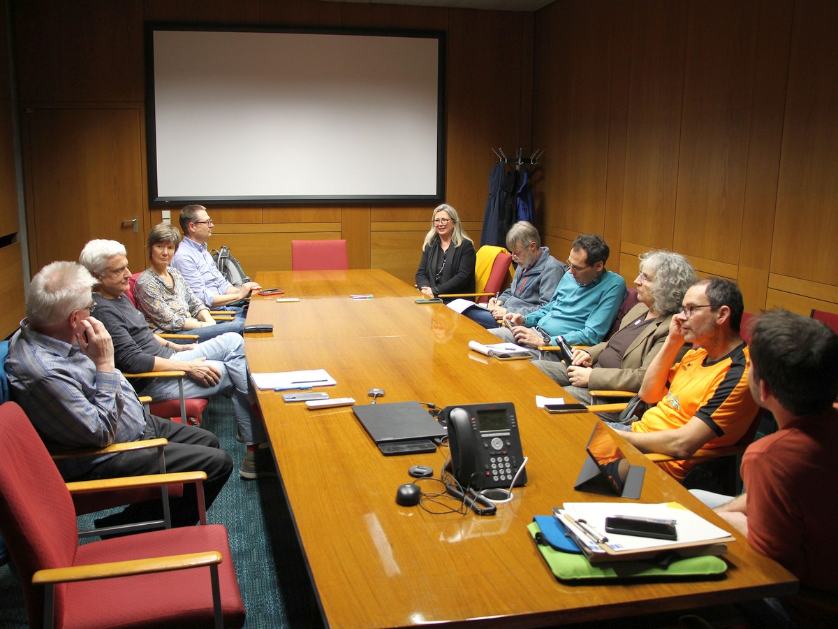 Die Vertreter der Arbeitsgruppen der Klimawerkstatt besprechen mit Michael Boeke (r.) von der KLiBA und mit Dr. Werner Krause (l.), Klimamanager der Gemeinde Sandhausen, die nächste Agenda. Gast ist Stefanie Damblon (5. v. l) von der KLiBA. die im Rathaus alle zwei Wochen eine Beratung durchführt. Foto: Gemeinde Sandhausen