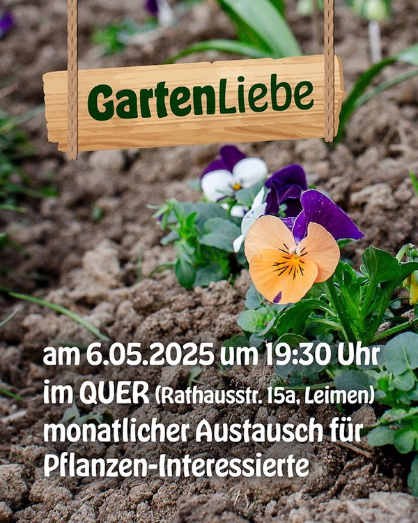 (geg – 2.5.25) In Leimen lädt die Initiative „GartenLiebe“ am 6. Mai 2025 um 19.30 Uhr wieder zum Austausch für Pflanzen-Interessierte ein. Treffpunkt ist das „Quer“ in der Rathausstraße 15a. Im Mittelpunkt des Abends steht der Umzug der im Haus vorgezogenen Jungpflanzen in den Garten sowie anstehende Gartenarbeiten im Mai. Auch Fragen rund um Zimmerpflanzen sind willkommen.
