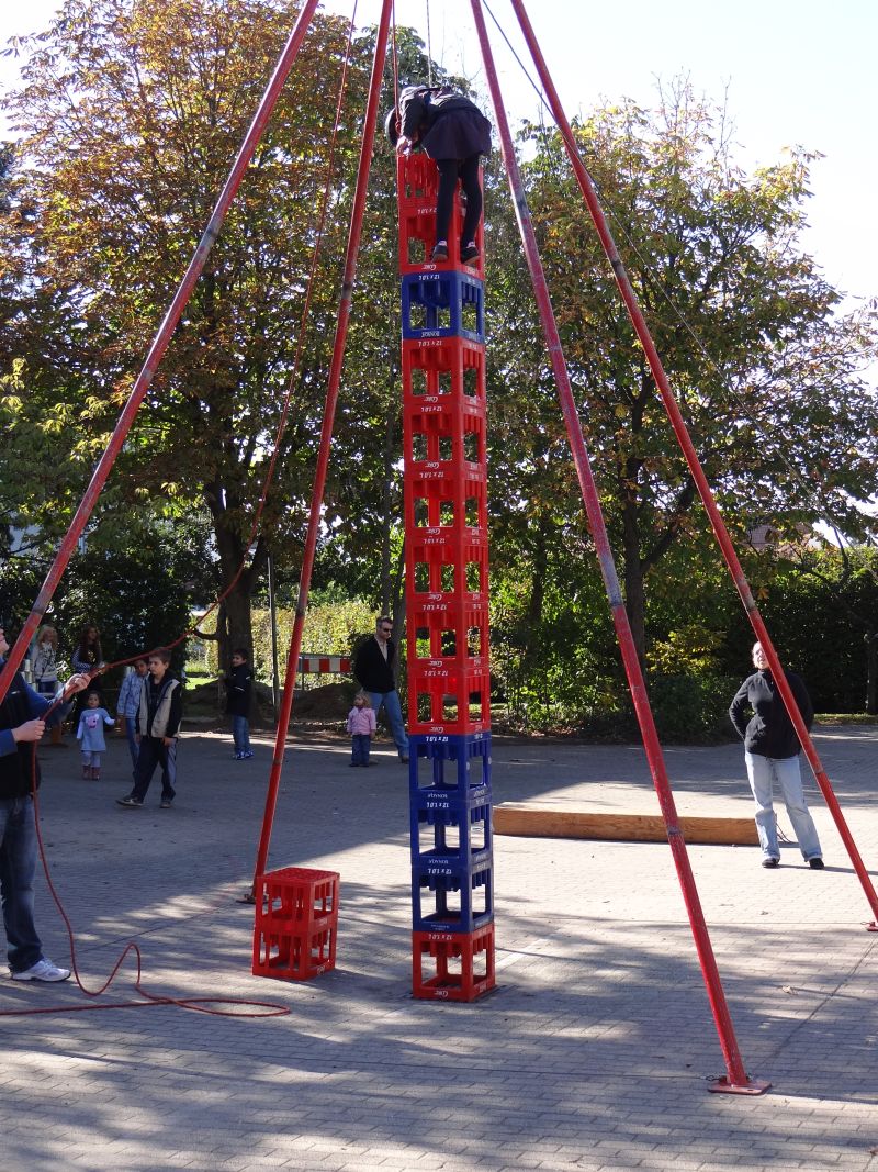 Ob es jemanden gelang die sprichwörtliche Nadel-im-Heuhaufen zu finden, ist nicht überliefert. Falls ja, wird man sie wohl aus der suchenden Hand herausgezogen haben müssen, denn die sehr aktive und agile Suche gerade der jüngeren Kinder war alles andere als ein vorsichtiges Tasten. Auch am Kistenkletterturm ging es gleich richtig zur Sache und die erste „Artistin“ schaffte es gleich 15 Kisten hoch, bis zum Anschlag!