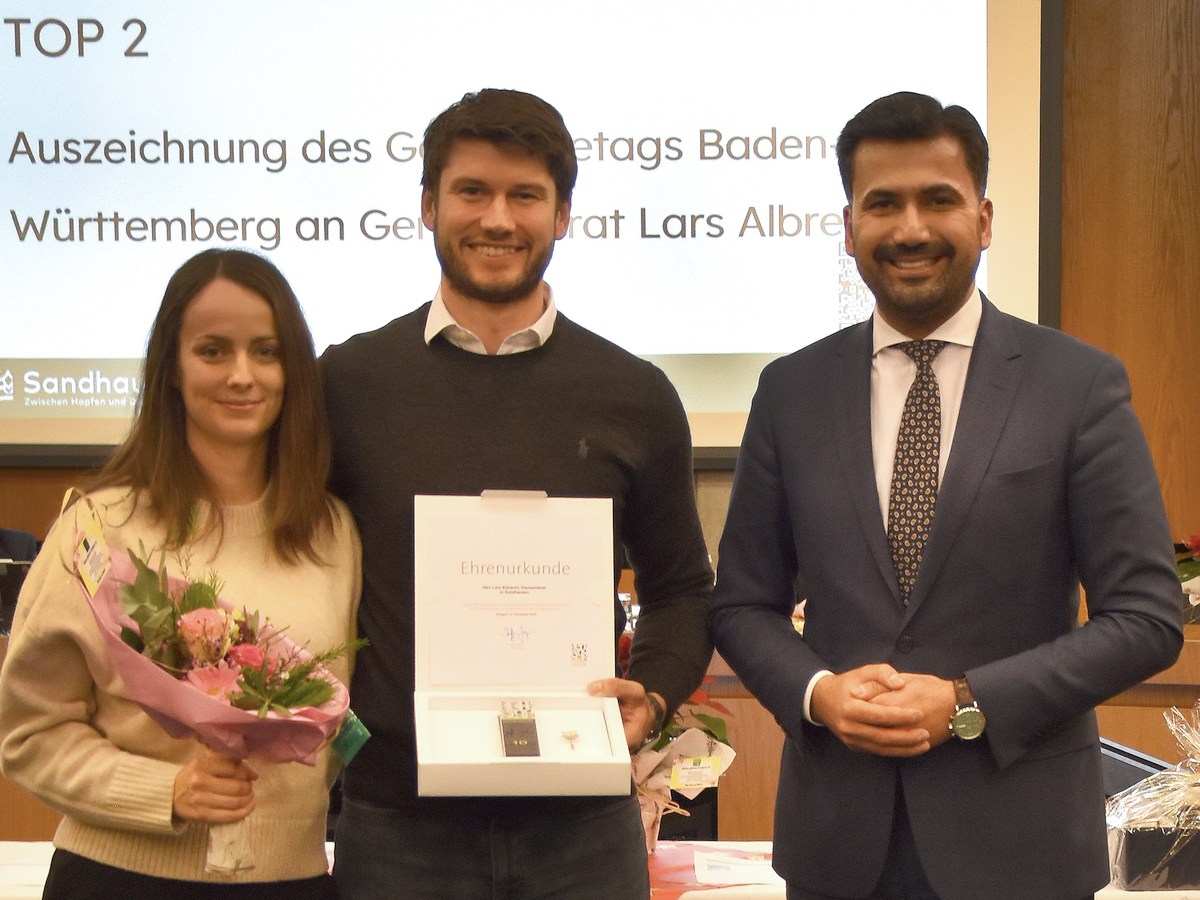 (mbr – 20.12.25) Seit nun mehr zehn Jahren setzt sich Lars Albrecht kommunalpolitisch ehrenamtlich für die Hopfengemeinde ein. Neben dankbarer Anerkennung für sein Engagement seit einem Jahrzehnt verlieh Bürgermeister Hakan Günes die Ehrenurkunde sowie die Nadel und die Stele des Gemeindetags Baden-Württemberg.