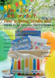 Was drin ist? Alles, was ein Straßenfest braucht – und vielleicht noch ein bisschen mehr. Von der Wimpelkette über Einladungskarten, Servietten, Luftballons, ein Kennenlern-Bingo bis hin zu Mini-Aschenbechern und Blumensamen. Ein Sack voller guter Laune, kostenfrei abzuholen im QUER oder bei Frau Darda im Historischen Rathaus.
