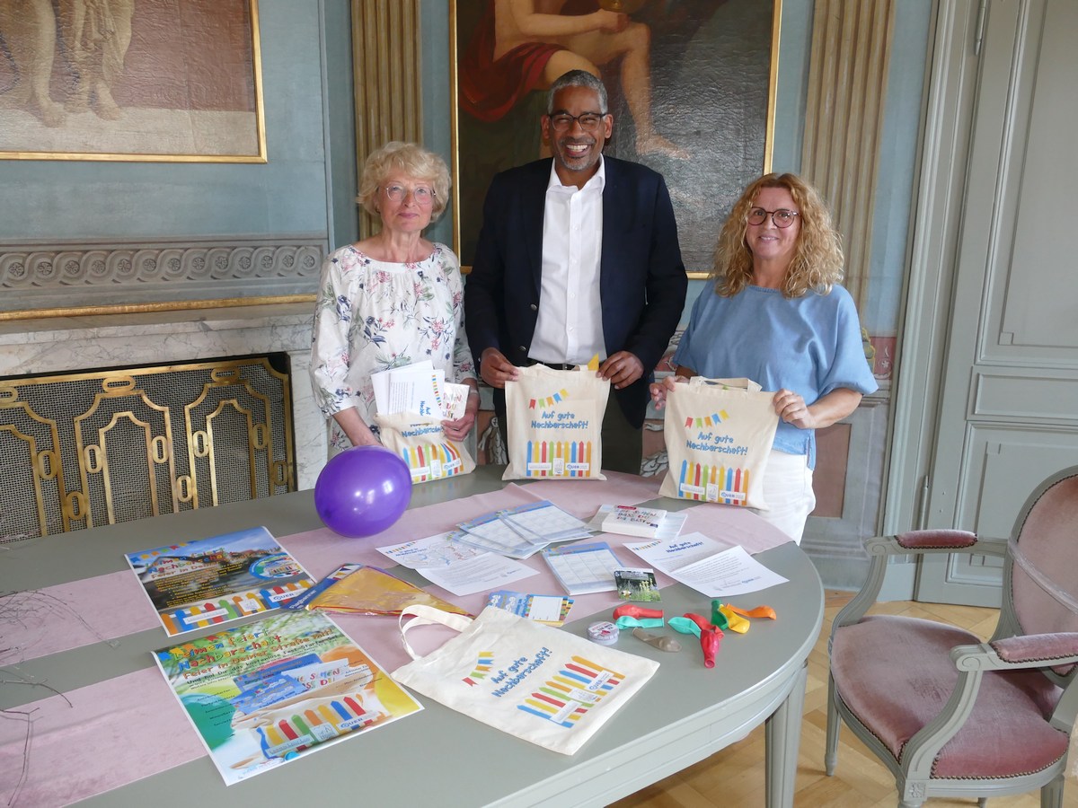 Stadt, Initiative und Quartiersmanagement ziehen an einem Strang: Rita Niemann-Geiger, OB John Ehret und Sabine Dards mit dem neuen Nachbarschafts-Set.
