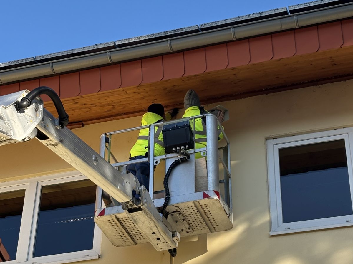 Herrn Hünicke und Herrn Holzwarth beim Anbringen der Schwalbennisthilfen.