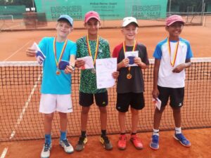 (bwl – 15.9.21) Am vergangenen Wochenende fanden auf der Anlage des TC Walldorf-Astoria die Badischen Mannschafts-Meisterschaften der Junioren U12 statt. Teilnehmer waren der TC Walldorf-Astoria (Bezirk 1), der TC Diedelsheim (Bezirk 2), der TC Rot-Weiß Achern (Bezirk 3) und unsere Jungen vom TC Blau-Weiß 64 Leimen (Bezirk 1). Am Samstag waren die Halbfinal-Spiele angesetzt, am Sonntag die Final-Spiele.