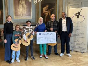 (14.10.25 – mu) Seit 2024 gibt es das Gitarrenorchester der Musikschule Leimen, das sehr erfolgreich arbeitet. Dank einer großzügigen Spende von 2.000 €, die am 13. Oktober 2025 in Form eines Schecks von Friederike Lehrnickel persönlich im Namen ihrer Stiftung übergeben wurde, kann diese Arbeit nun dankenswerter Weise fortgesetzt werden.