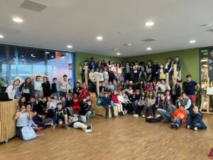 Gruppenfoto von über 100 Schüler:innen der Turmschule Leimen in der KLIMA ARENA Sinsheim