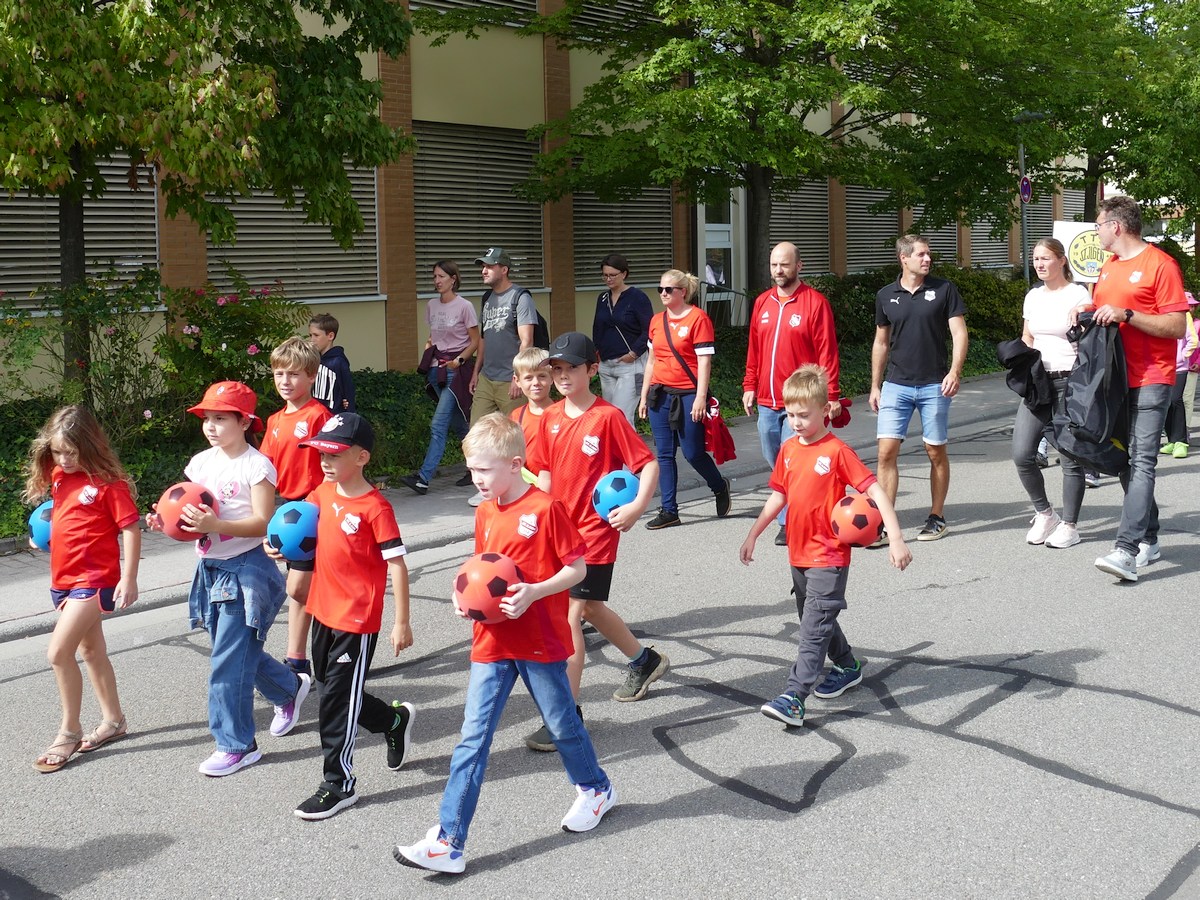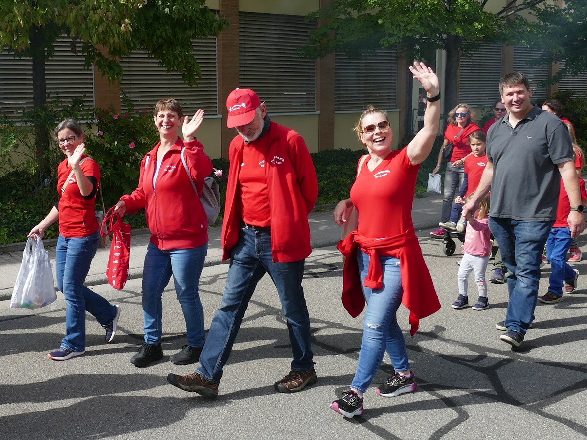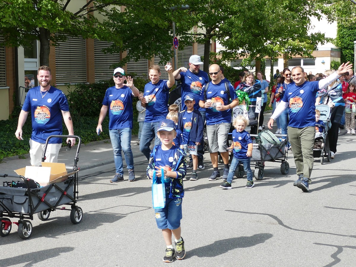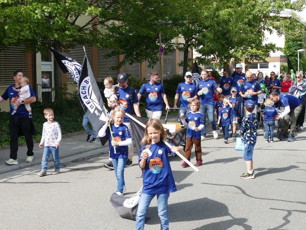 Mit leuchtend roten Shirts, breitem Lächeln und fröhlichem Winken zeigte sich der TV Germania St. Ilgen. Die Gruppe lief mit Eltern, Kindern und Vereinsfreunden – und brachte sportliche Energie auf die Straße. Einige Kinder trugen stolz die Vereinsshirts, andere hielten sich an Mama oder Papa fest und winkten mit beiden Händen.