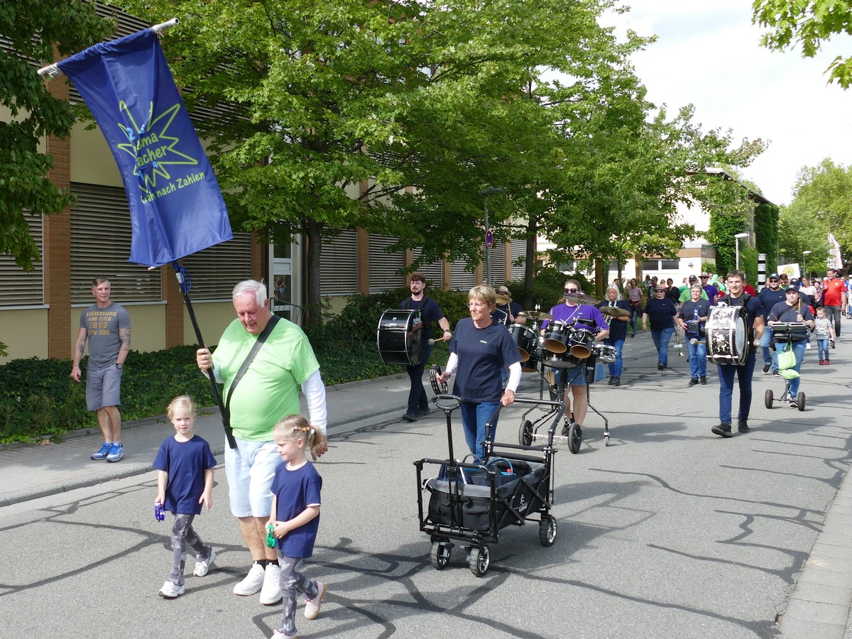 Gleich dahinter schob sich ein leichter Nebel über den Asphalt – kein Gewitter, sondern ein Bollerwagen, aus dem es dampfte: Die Beach Boyz des TC Kurpfalz zogen mit cooler Musik, Rauchmaschine und Kinderfans durch die Straßen. Blaue Trikots, Kinderwagen, Popcorn und Fahnen – ein kleiner Karneval mitten im September.
