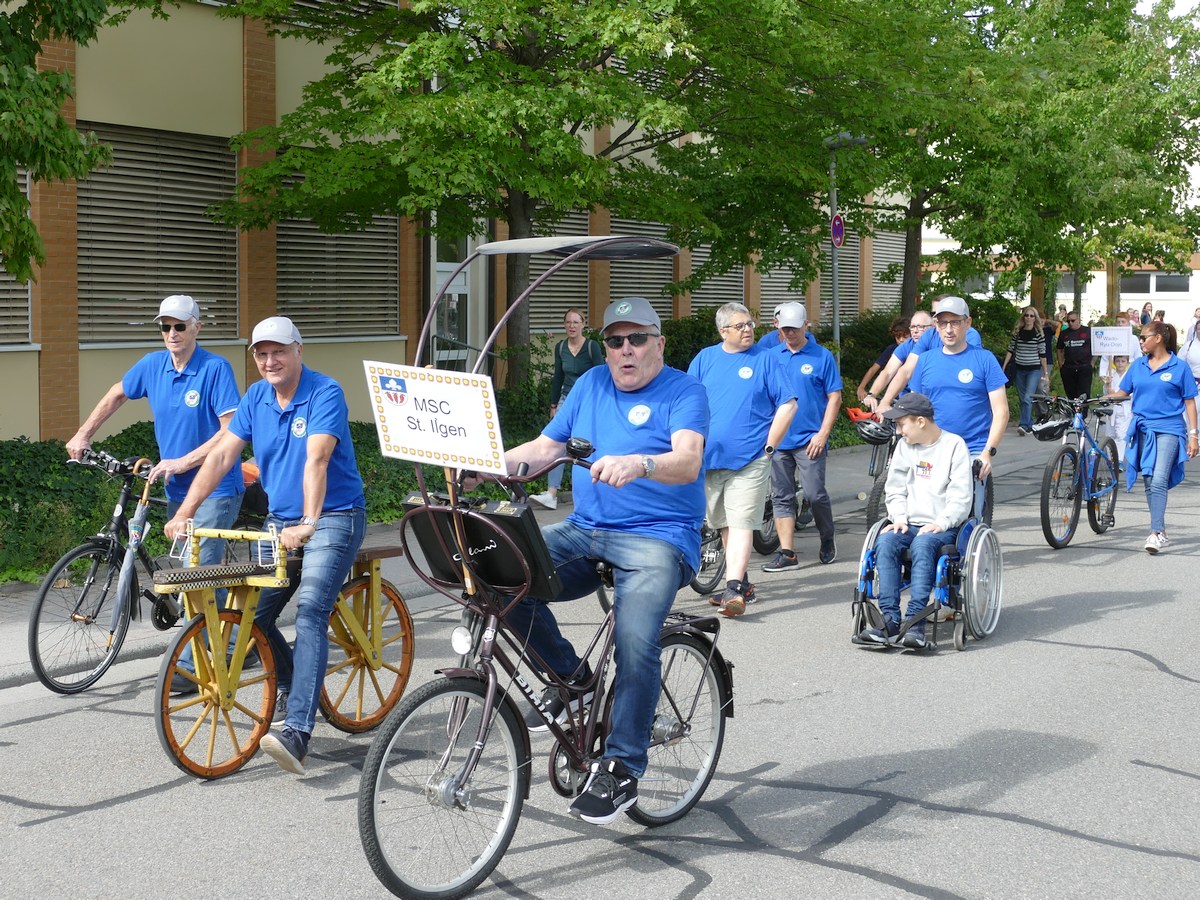 Der MSC St. Ilgen zeigte die Geschichte auf zwei Rädern: Vom Laufrad bis zum Hochrad rollten die Mitglieder durch die Straßen – darunter auch ein Kind im Rollstuhl. Ein starkes Bild für Mobilität und Miteinander, Technikliebe und Zusammenhalt.