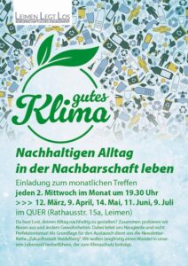 In entspannter Atmosphäre wird über viele unterschiedliche Lebensbereiche – von Mobilität über Konsum bis zu Energie – gesprochen. Der Fokus liegt dabei darauf, mit kleinen Schritten etwas für sich, für die unmittelbare Umgebung und Leimen zu erreichen. Interessierte Bürgerinnen und Bürger sind willkommen.