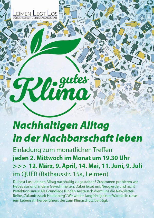 Leimen Legt Los lädt zum zweiten Treffen der Klimagruppe am 12. März 2025 um 19.30 Uhr im QUER in der Rathausstraße 15a ein.