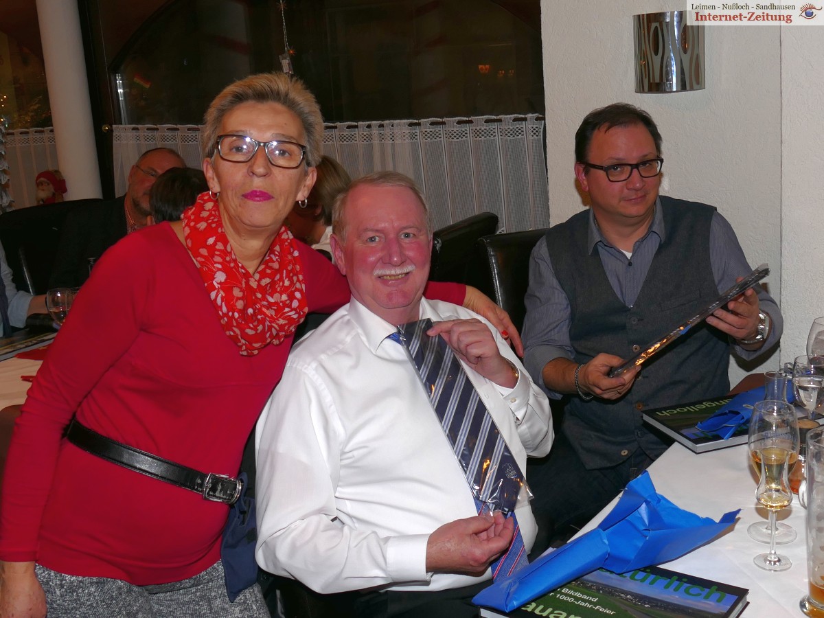 Nach dem Essen folgte auch noch eine Bescherung der Gemeinderäte durch OB Reinwald. Die Damen erhielten ein Halstuch und die Herren eine Krawatte mit dem Aufdruck des Stadtlogos und zusätzlich ein Exemplar des Buches „1000 Jahre Gauangelloch“. Als Vertreter des Rates bedankten sich Hans Appel und Dr. Peter Sandner bei Frau Dr. Kerstin Reinacher-Reinwald und Bürgermeisterin Claudia Felden mit einem hübschen Blumenstrauß.