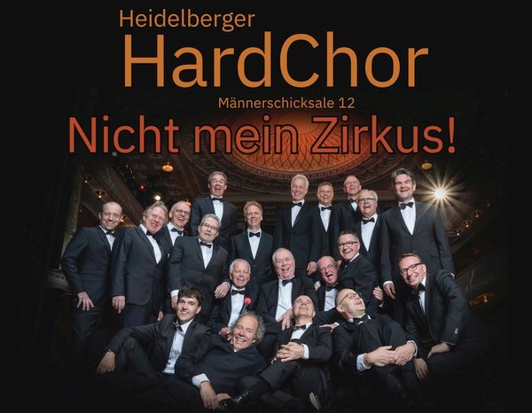 (pm – 4.11.25) Die Welt der Manege ist für den Heidelberger HardChor kein Thema, im Gegenteil: Unter dem Titel „Nicht mein Zirkus“ schwingt sich der maskuline Klangkörper unter seinem Dirigenten Bernhard Bentgens einmal mehr auf das Hochseil der Männerschicksale. Dort balancieren die Sänger zwischen intellektuellen Pirouetten und emotionalen Tiefschlägen und jonglieren mit ihren eigenen existenziellen Themen: Fernweh und Beziehungsfrust, Gefühlsmanagement und Föhnfrisur, Kampf ums Milchaufschäumgerät im Büro und nicht zuletzt mit der Frage: Wie spricht man eigentlich Stracciatella mit vollem Mund aus?