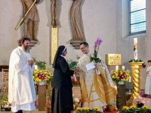 Am Ende des Gottesdiensts gab es noch eine besondere Gratulation: Schwester Jerose hatte zu Beginn des Jahres das Jubiläum ihrer 25jährigen Profess gefeiert. Da sie zu diesem Jubiläum aber in Indien weilte, wurde der Glückwunsch der Pfarrgemeinde nun mit einem kleinen Blumenpräsent nachgeholt. Pfarrer Henn würdigte dabei den stetigen Einsatz von Schwester Jerose, um Gottes Liebe in der Welt sichtbar werden zu lassen.