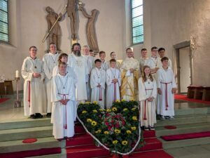 Pfarrer Henn predigte eindrucksvoll über die brennende Liebe Gottes zu den Menschen, wofür das Herz ein passendes Zeichen sei. Er freute sich auch über die große Ministrantenschar, die für diesen Gottesdienst zusammengekommen war. Sogar aus Nußloch und Gauangelloch waren Ministranten zur Verstärkung gekommen.