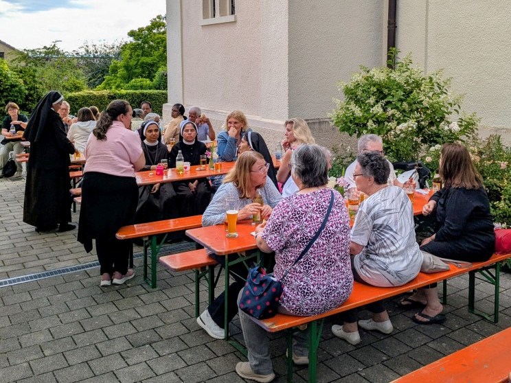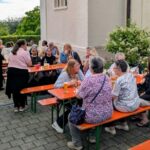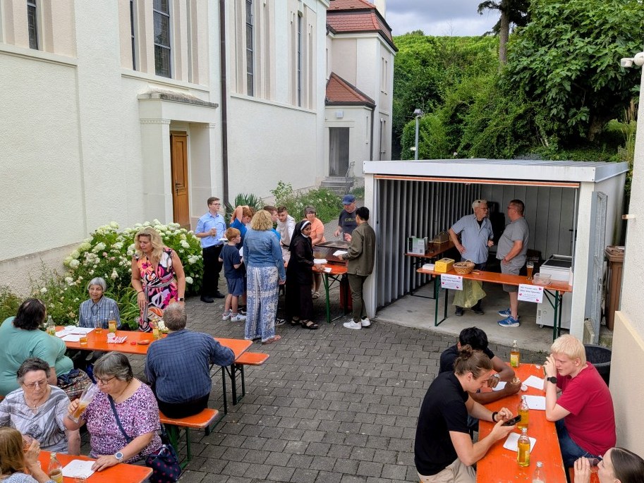 Nach dem Gottesdienst ging die Feier dann bei herrlichem Sommerwetter neben der Kirche weiter. Das Gemeindeteam hatte die Tische gedeckt und das Essen vorbereitet: Es gab Bratwurst und Burger vom Grill, dazu kühle Getränke, anschließend Eis und Kuchen von der Frauengemeinschaft. Besonders die Jugend, die vorher das Essen mit ausgesucht hatte, freute sich über die Burger und langte auch kräftig zu. Auch die vegetarische Burger-Variante fand dankbare Abnehmer. Zum Schluss war restlos alles aufgegessen!