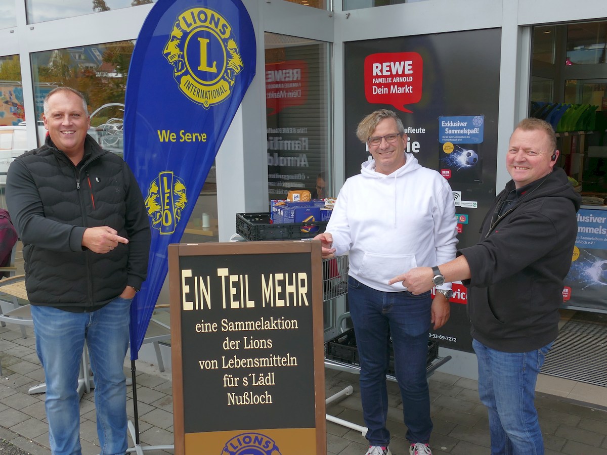 Bei REWE Arnold in Nußloch spielte der Zufall mit: Parallel zur Lions-Aktion fand eine Veranstaltung des FV Nußloch statt, die für ordentlich Kundenandrang sorgte – und damit wohl auch für volle Spendenkörbe.