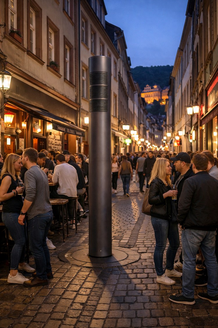 Das Prinzip ist von hochwertigen Kopfhörern bekannt: Mikrofone erfassen den Umgebungslärm, eine KI berechnet in Millisekunden die exakte Gegenwelle und spielt diese über Lautsprecher ab. In Heidelberg soll dieses Konzept nun erstmals „Open Air“ skaliert werden. Entlang der lärmintensiven Hotspots werden dezente, etwa drei Meter hohe Anthrazit-Säulen installiert.