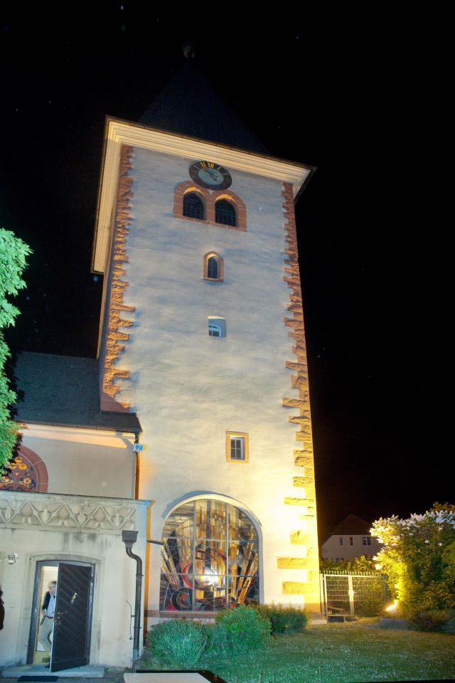 Ja vor gut 10 Jahren war es passiert. Die heute noch vorhandene Außenbeleuchtung wurde gekappt und unsere schöne Mauritiuskirche lag fortan in den Abendstunden im Dunkeln. Nun in der Osternacht 2011von Samstag auf Sonntag wurde unsere Kirche, das älteste Gebäude in der Stadt, erstmals wieder angestrahlt. Die Initiative des Evangelischen Gemeindevereins hatte Erfolg und die Besucher des Osternachtgottesdienstes waren sichtlich begeistert. Zu Beginn des Gottesdienstes lag alles noch im Dunkeln und erst nach Ende des Gottesdienstes und beim Verlassen der Kirche war – dank der technischen Mithilfe der Firma Elektro Lutsch – das Kirchengebäude von außen beleuchtet und viele waren erstaunt, wie schön das doch aussah. Nach Pfarrer Steffen Groß passte das Licht sehr gut zum Gedanken von Ostern und zur Wiederauferstehung Christi.