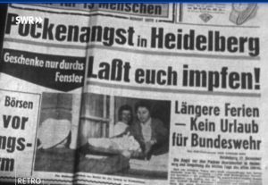Der letzte größere Ausbruch einer tödlichen Seuche ereignete sich in unserer Region vor gut 60 Jahren. Während der „Heidelberger Pockenfälle“ im Dezember 1958 erlagen zwei Menschen dieser Krankheit. Auslöser der Pockenwelle war ein Arzt der Ludolf-Krehl-Klinik, der sich auf einer Indienreise mit den Pocken infiziert hatte. Nachdem die Krankheit erkannt worden war, wurden umfangreiche Quarantänemaßnahmen erlassen, allein in der „Krehl“ waren über 400 Menschen isoliert, zwei weitere Quarantänestationen wurden eingerichtet. Da vielfach gegen die Quarantänevorschriften verstoßen wurde, kam die Polizei zum Einsatz, um die Maßnahmen durchzusetzen. Die „Heidelberger Pockenfälle“ machten in der ganzen Bundesrepublik Furore, Hotelzimmer wurden reihenweise storniert, der Umsatz der Gaststätten brach ein. Über die dramatischen Heidelberger Ereignisse findet sich in der Mediathek des Südwestrundfunks ein Zusammenschnitt von Filmdokumenten, unter anderem auch ein interessantes Interview mit dem damals gerade neu gewählten Oberbürgermeister Robert Weber.