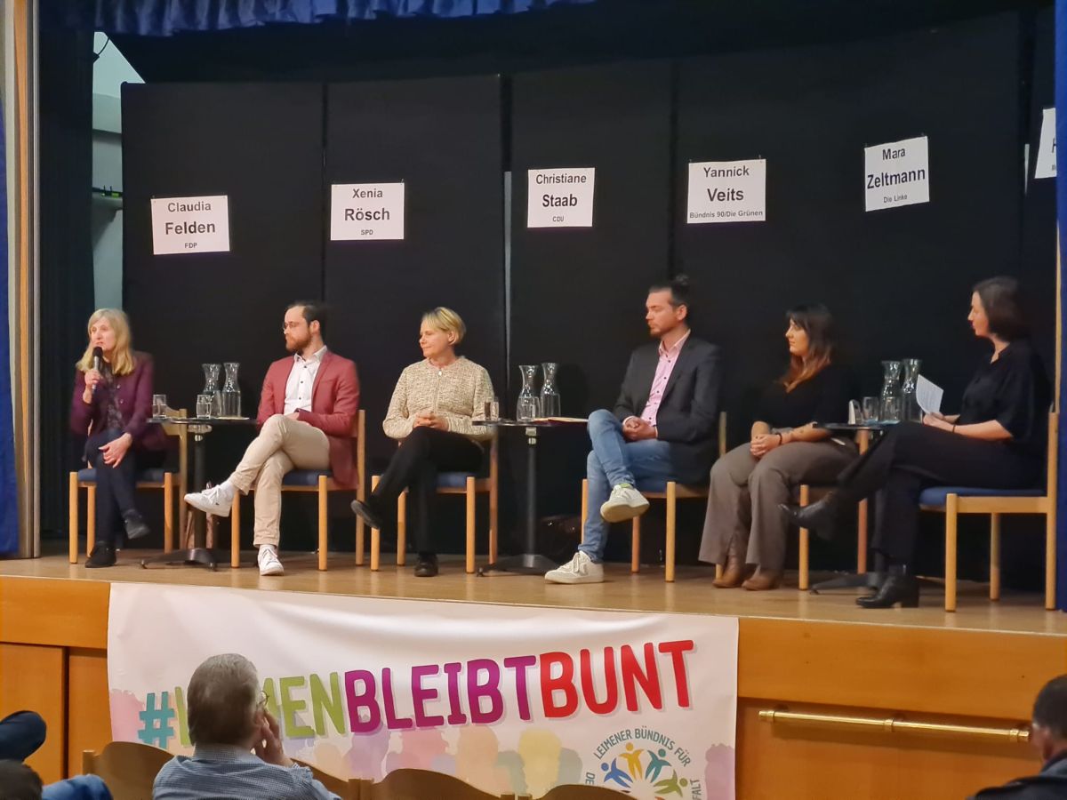 Hausherrin und Bündnismitglied Pfarrerin Natalie Frey begrüßte das Publikum und die fünf Kandidierenden auf dem Podium. Eingeladen und anwesend waren die Leimener Bürgermeisterin Claudia Felden (FDP), die Landtagsabgeordnete Christiane Staab (CDU) und Yannick Veits (Bündnis 90/Die Grünen). Marlon Käsemann (Linke) hatte aus terminlichen Gründen seine Zusage zurückziehen müssen, er wurde vertreten von seiner Parteikollegin Mara Zeltmann, die im Wahlkreis Schwetzingen antritt. Für die an Corona erkrankte SPD-Kandidatin Xenia Rösch sprang kurzfristig ihr Zweitkandidat Florian Mattheier an, der die Positionen seiner Parteikollegin aber sehr genau kannte, so dass man sich im Publikum dennoch ein gutes Bild machen konnte.