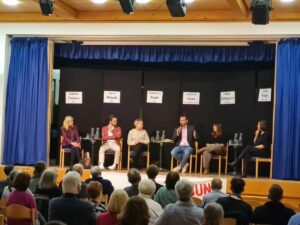 Nach einer informativen Vorstellungsrunde mit den Kandidierenden, bei der auch persönliches der Kandidierenden zur Sprache kam, stellte Moderatorin Katja Hilser Fragen in den drei Themenblöcken Familienpolitik, Verkehr/Energiewende und Finanzen. Dabei wurde deutlich, dass sich die Kandidierenden in einigen Bereichen wie dem Bürokratieabbau und der dringend nötigen besseren finanziellen Unterstützung für die Kommunen durchaus einig waren. Bei anderen Fragen z.B. nach der Bezahlbarkeit von Kinderbetreuung oder der Förderung von Windkraft gab es aber unterschiedliche Eisnchätzungen und nicht immer wurden Lösungsansätze präsentiert.