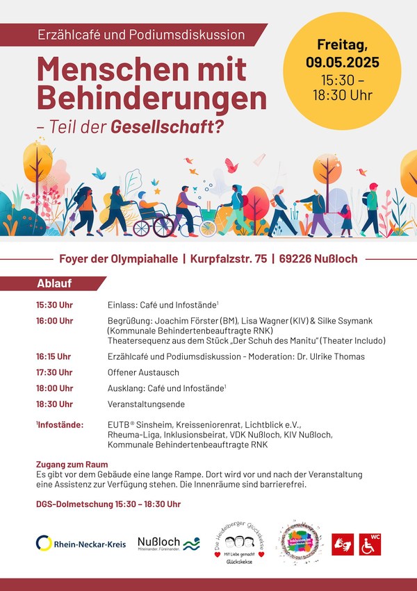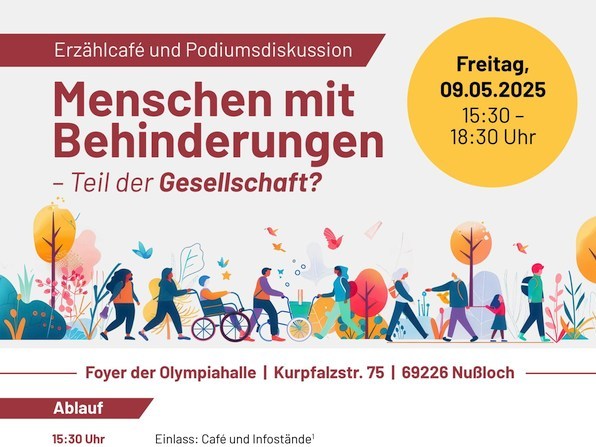(kar – 6.5.25) Wenn Stimmen gehört, Lebenswege geteilt und Barrieren sichtbar gemacht werden, entsteht ein Raum für echte Begegnung. Genau das geschieht am Freitag, den 9. Mai, von 15:30 bis 18:30 Uhr im Foyer der Olympiahalle Nußloch. Unter dem Motto „Menschen mit Behinderungen – Teil der Gesellschaft?“ lädt ein Erzählcafé mit Podiumsdiskussion dazu ein, Perspektiven zu wechseln, zuzuhören – und zu handeln.