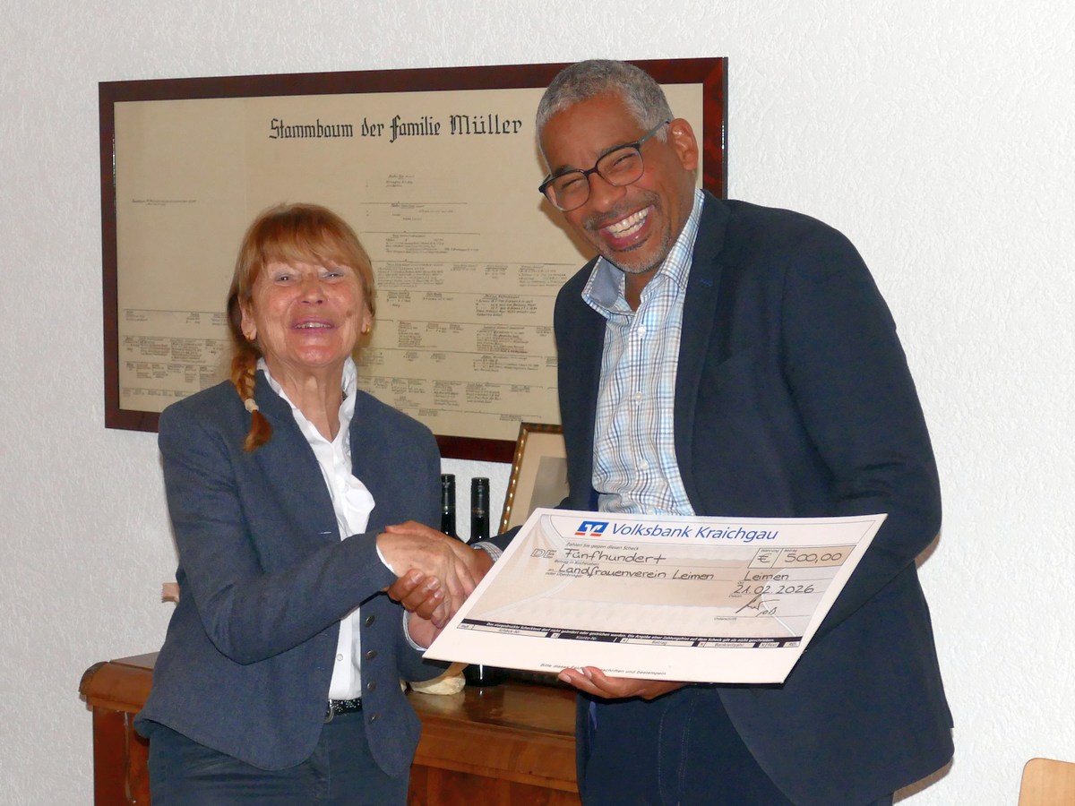 Zum Jubiläum überreichte er auch als Gastgeschenk einen Scheck über 500,- €, wobei er erläuterte, dass das Geld beim Verein verbleiben, der symbolische Scheck allerdings wieder mitgenommen werden müsse. Man habe nur einen und der werde immer wieder verwendet und mit wasserlöslichem Edding ausgefüllt. Je nach Anlaß. Die Zuhörer schmunzelten.