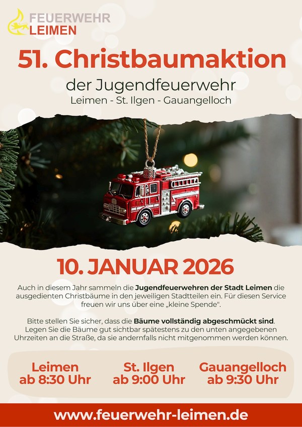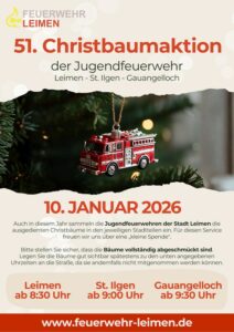 (fwu – 31.12.25) Am 10. Januar 2026 ruft die Jugendfeuerwehr der Stadt Leimen – in den Ortsteilen Leimen, St. Ilgen und Gauangelloch – bereits zum 51. Mal zur traditionellen Christbaumaktion. Ein halbes Jahrhundert gelebter Bürgersinn wird somit fortgeführt, ganz im Geiste jener tätigen Nächstenliebe, die in der Tat dem bürgerlichen Gemeinwohl dient.