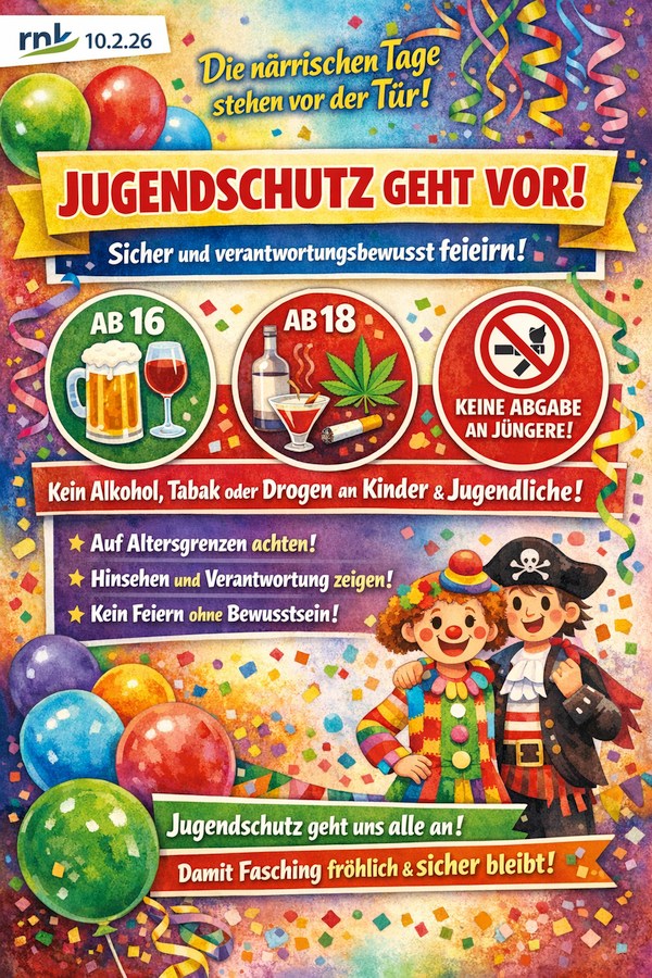(rnk – 10.2.26) Die Faschingszeit nähert sich ihrem Höhepunkt. Umzüge, Faschingsveranstaltungen und der Straßenfasching laden in den kommenden Tagen wieder zum fröhlichen gemeinsamen Feiern ein. Damit diese Zeit für alle zu einem positiven Erlebnis wird, darf der Schutz von Kindern und Jugendlichen jedoch nicht aus dem Blick geraten. Das Jugendamt des Rhein-Neckar-Kreises weist deshalb darauf hin, dass die Bestimmungen des Jugendschutzes auch während der närrischen Tage uneingeschränkt gelten.