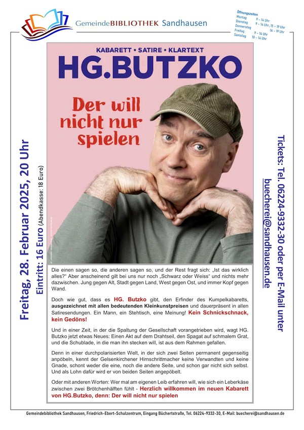 Und das Lachen wird uns retten – spätestens an diesem Abend, wenn wir uns ein Lebensrätsel zwischen zwei Brötchenhälften füllen. Herzlich willkommen im neuen Kabarett von HG. Butzko, denn: Der will nicht nur spielen.