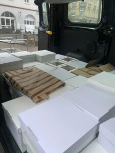 Soviel Kuchen zusammen zu bekommen war nicht nur eine organisatorische, sondern auch logistische Herausforderung, aber es hat sich gelohnt, unterstützt wurde ich hierbei von der Freundin meines Sohnes. Bedanken möchte ich mich bei dem Sozialverein „Auf Augenhöhe/Tafel“, deren Bus wir nutzen durften, da solche Mengen nicht mehr in einem normalen PKW unterzubringen sind.