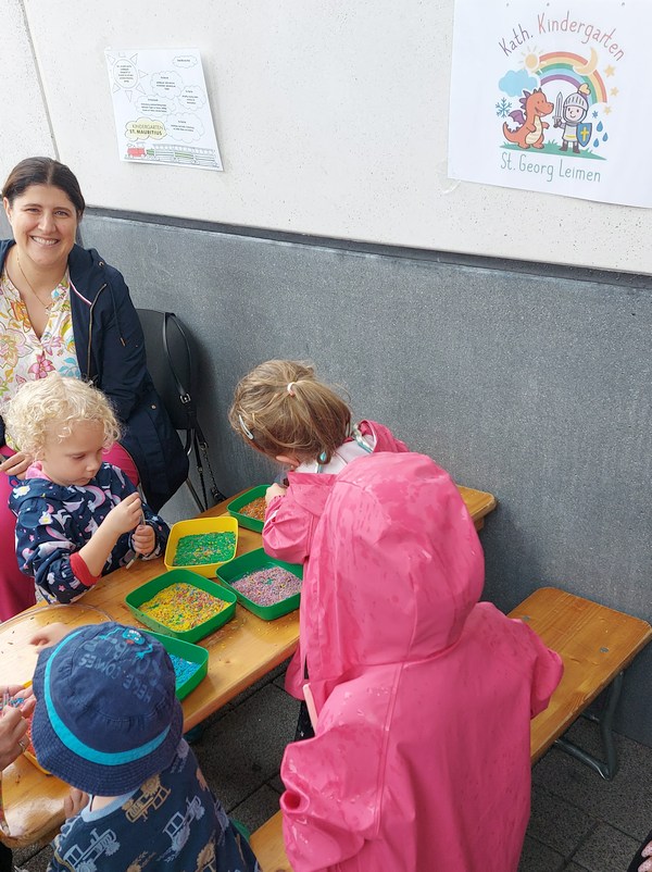 (pm – 25.9.25) Am vergangenen Wochenende war auch unser Kindergarten bei der Leimener Kinderkerwe vertreten. Trotz des anhaltenden Regenwetters am Sonntag ließen wir uns die gute Laune nicht nehmen und boten den kleinen Besucherinnen und Besuchern für zwei Stunden eine kreative Bastelaktion an – bunte Reisarmbänder gestalten.