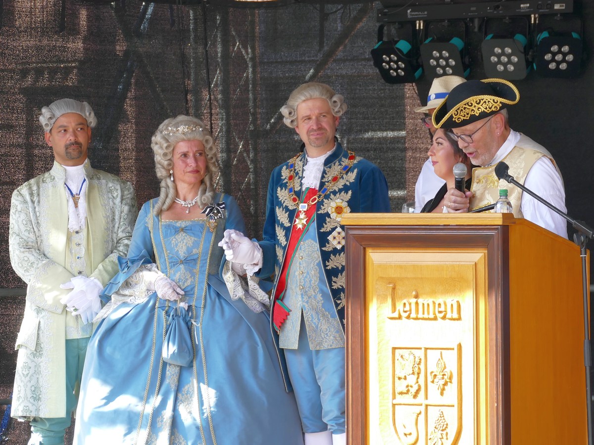 Und wir alle in diesem Rund begrüßen ganz herzlich und freuen uns sehr, die da kamen von Schwetzingen her: Churfürst Karl Theodor von der Pfalz und seine Gemahlin Elisabeth Auguste. Und darauf: Ein Fröhlich`Pfalz, Gott erhalt`s! Und hier tue ich nochmals kund: der Leimener „Kerwe-Schlossherr“ leitet sich ab von Aaron Elias Seligmann, der 1747 in Leimen als Jude geboren wurde und im Jahre 1824 im Range eines „Königlich Bayerischen Hofbankiers“ in München verstorben ist.