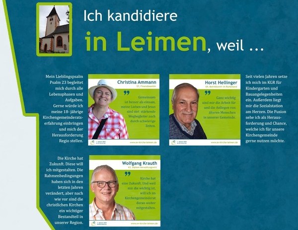In Leimen kandidieren unter anderem Christina Ammann, Horst Hellinger und Wolfgang Krauth. Ammann, Finanzbeamtin, hält fest: „Gemeinsam ist besser als einsam.“ Hellinger engagiert sich seit Jahren für die Anliegen älterer Gemeindeglieder, Krauth sieht die Kirche als festen Bestandteil der Region – auch wenn sich die Zeiten ändern.