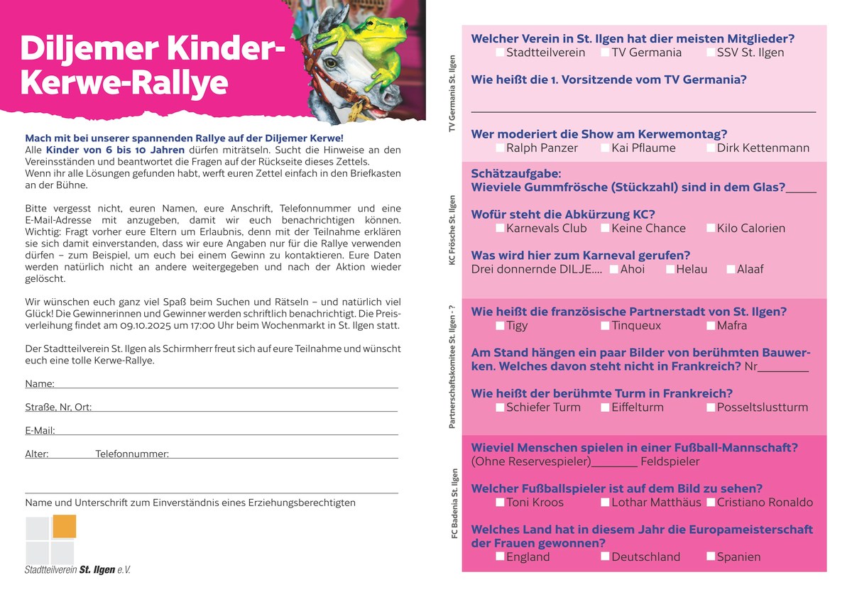 „Mama, darf ich mitmachen?“ — Diese Frage hallt an diesem Wochenende sicher öfter über den Festplatz. Denn für die Rallye braucht’s nicht viel: einen Stift, ein bisschen Entdeckerfreude – und die Erlaubnis der Eltern. Wer mitmacht, lernt ganz nebenbei, was einen Stadtteilverein ausmacht, wie der französische Partnerort heißt oder warum Karneval in St. Ilgen „Drei donnernde DILJE…“ ruft.