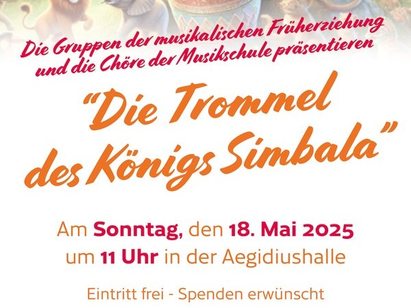 (kar – 2.5.25) Mit großer Vorfreude lädt die Musikschule Leimen am Sonntag, den 18. Mai 2025, um 11 Uhr in die Aegidushalle zu einer ganz besonderen Veranstaltung ein: Unter dem Titel „Die Trommel des Königs Simbala“ zeigen die Gruppen der musikalischen Früherziehung sowie die Chöre der Musikschule ein liebevoll inszeniertes Musikmärchen, das nicht nur kleine, sondern auch große Besucher:innen begeistert.