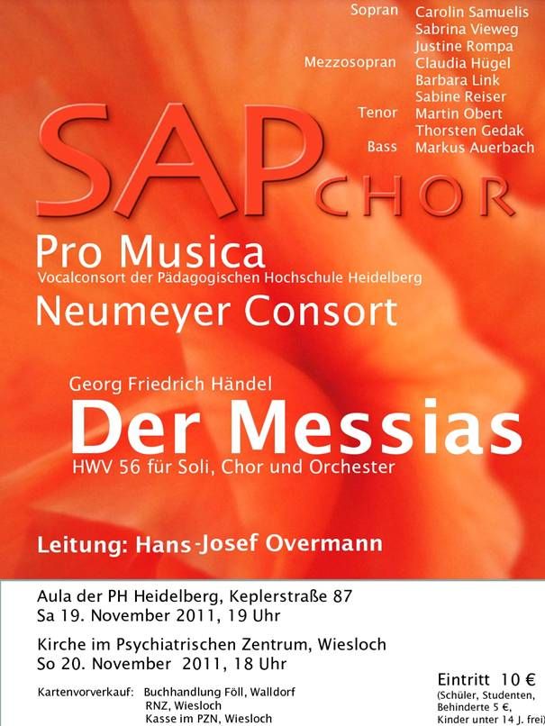 Schon in Kürze gibt es die Gelegenheit, Overmann/Samuelis erneut zu erleben. Am 19. (PH Heidelberg) und 20. November (PZ Wiesloch) mit Händels „Messias“ (Plakat unten).