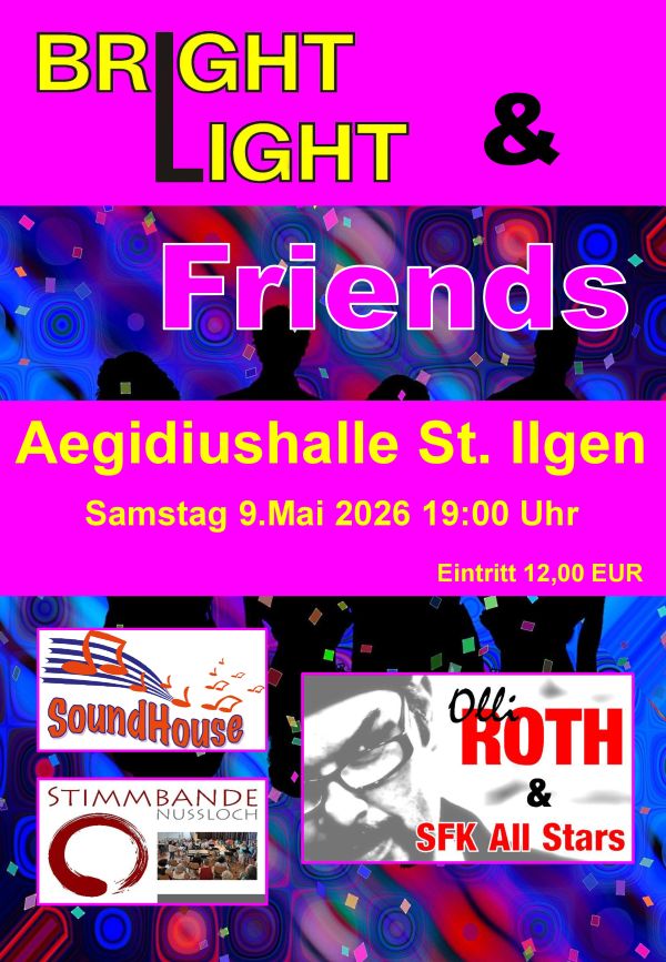 Der Chor Bright Light veranstaltet am Samstag, 9. Mai 2026, ab 19.00 Uhr einen besonderen Konzertabend und hat dazu die befreundeten Chöre „Soundhouse“ aus Sandhausen und „Stimmbande“ aus Nußloch eingeladen.