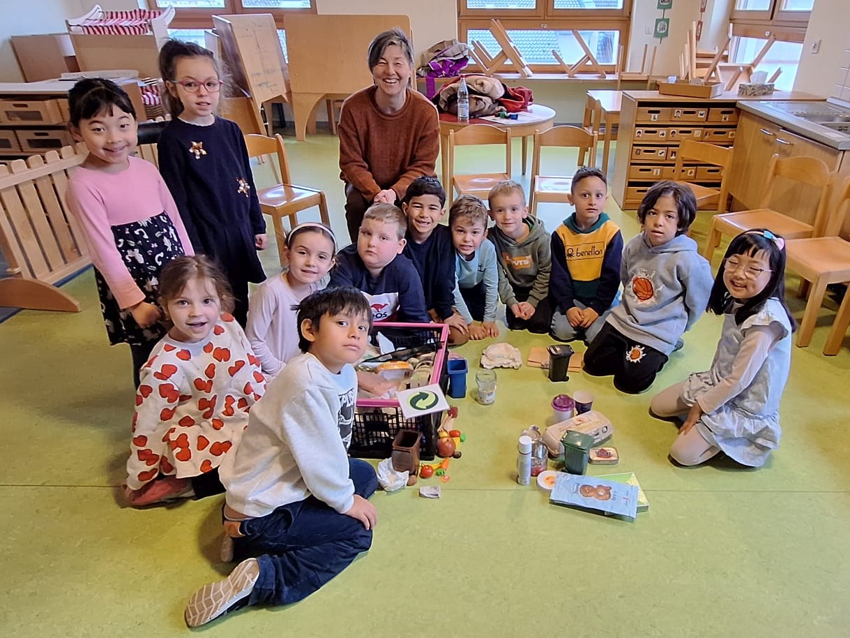 Die Kinder sortierten gemeinsam viele verschiedene Abfälle in die jeweiligen Abfallbehälter. Wie viele Abfälle in die Grüne Tonne plus gehören, löste bei den Kindern Erstaunen aus. Die Kinder stellten die Abfälle aus Kunststoff, Metall, Papier und Karton, wie z. B. Eierschachteln, Nussdosen, leere Spraydosen, Papiertüten und sogar eine Espressokapsel zur Grünen Tonne plus. Dabei war es manchmal ziemlich schwierig, die Materialart der Abfälle herauszufinden. Oft hilft das Geräusch beim Klopfen auf den Gegenstand, das Material herauszufinden, vor allem wenn es sich um Metall handelt. Die Abfälle aus der Grünen Tonne plus werden in der Wertstoffsortieranlage Sinsheim sowohl von Maschinen als auch per Hand sortiert und zu Firmen gebracht, die daraus neue Produkte herstellen.